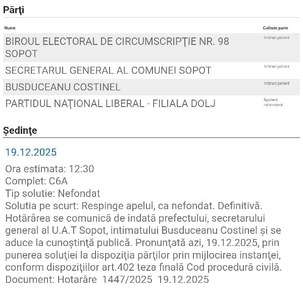 Tribunalul Dolj a respins astăzi definitive acțiunea în instanță a Partidului Național Liberal, filial Dolj, prin care contesta validarea mandatului de primar al lui Costinel Busduceanu, câștigătorul alegerilor parțiale din data de 7 decembrie, din comuna Sopot.